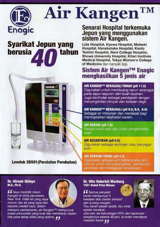 2. Akhirnya, sekitar tahun 1974, Syarikat Enagic Jepun dengan teknologi pengolahan air alkali telah mencipta alat mesin untuk keperluan rumah sakit di sana. Malahan, teknologi ini telah diperkemaskan dalam satu mesin kecil bernama Leveluk SD501 untuk keperluan rumah tangga beberapa tahun kemudian.