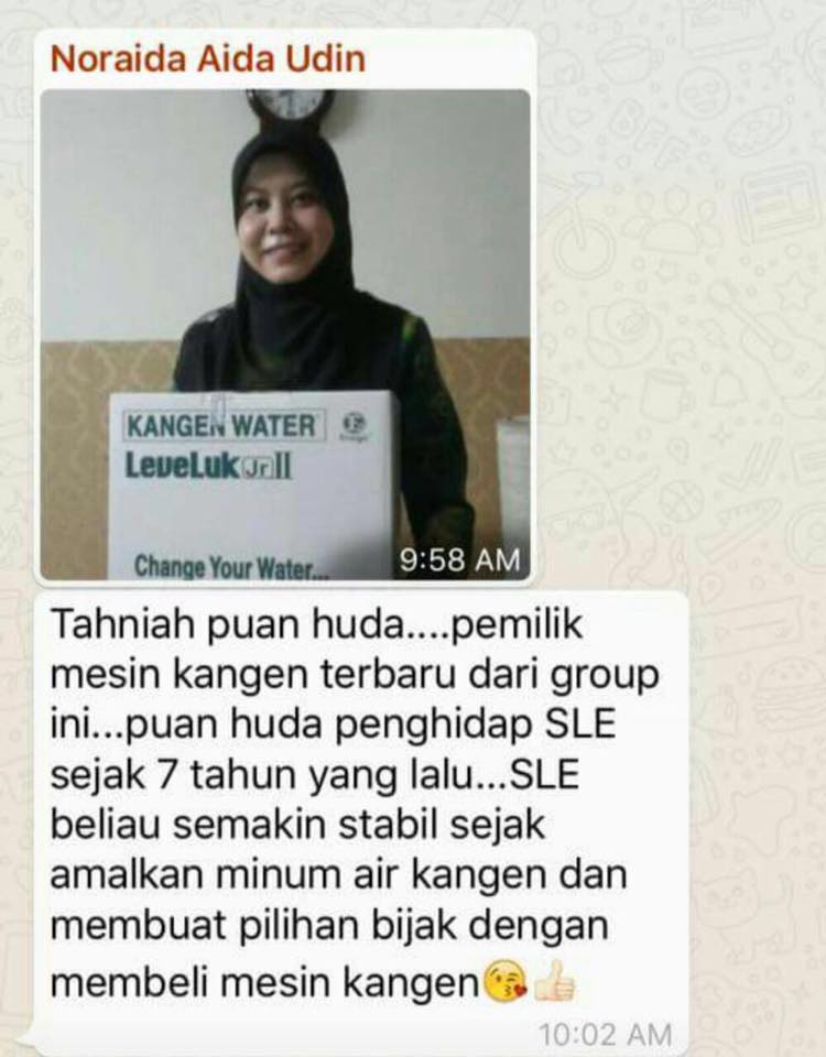 Sudah diketahui ramai dan dari dulu lagi bahawa Kangen Water terbukti sebagai minuman kehidupan seharian anda yang mampu mengatasi atau menjadi penawar kepada beberapa masalah penyakit disamping mengambil ubat-ubatan sampingan. Namun pada hari ini, saya ingin menyedarkan anda semua bahawa Kangen Water bukan sahaja ditujukan kepada pesakit tetapi juga kepada golongan yang tidak mempunyai apa-apa penyakit. Mengapakah saya berkata demikian? Sila baca kenyataan di bawah sehingga habis!